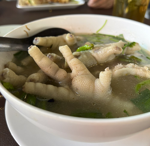 Having looked at the picture on the menu and with a slightly delicate stomach I thought the chicken soup would be perfect. The picture showed what looked like a chicken leg, that’ll be fine, I could manage that, it was really the broth I was after. It was suggested some stirfried noodles (vermecilli) were ‘very nice’ with it…a few minutes later a bowl overflowing with what appeared to be little childrens hands plus the fingers was put down in front of me…chicken claws, not a leg in sight. With spoon and fork I lifted the wee pleading hands and gently placed them on a plate. The broth proved to be very firey and so I abandand the lot and reordered barbeque chicken.