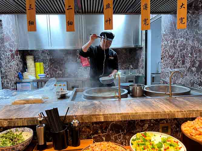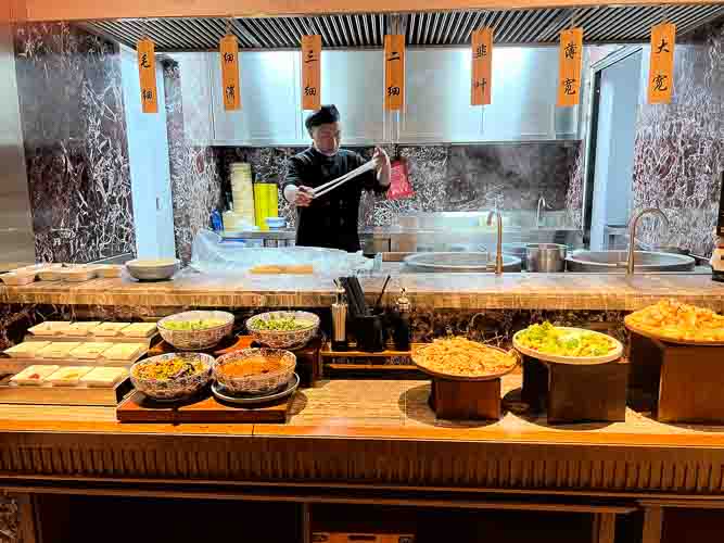 This morning the 8th of April we were treated to a bowl of freshly made Lanzhou Beef Noodles for breakfast. It was wonderful to watch the chef make your portion of noodles on the spot, just throw them into boiling water for a few minutes and then his assistant scoop them into a bowl to be filled with broth, a spoonful of beef pieces and leave us to add the spices and other delicacies. It’ll be hard going back to cornflakes!