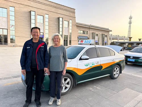 Next day he arrived with a big bag of local pastries and two cartons of the local speciality - ‘apricot peel tea’. There wasn’t too much of the stuff around Dunhuang to interest us, although we did get to see the last customs post on the silk route with it’s spectacular location at the very edge of the desert and the crescent lake and it’s spectacular sand dunes. On the last morning Xu picked us up to take us to the station.